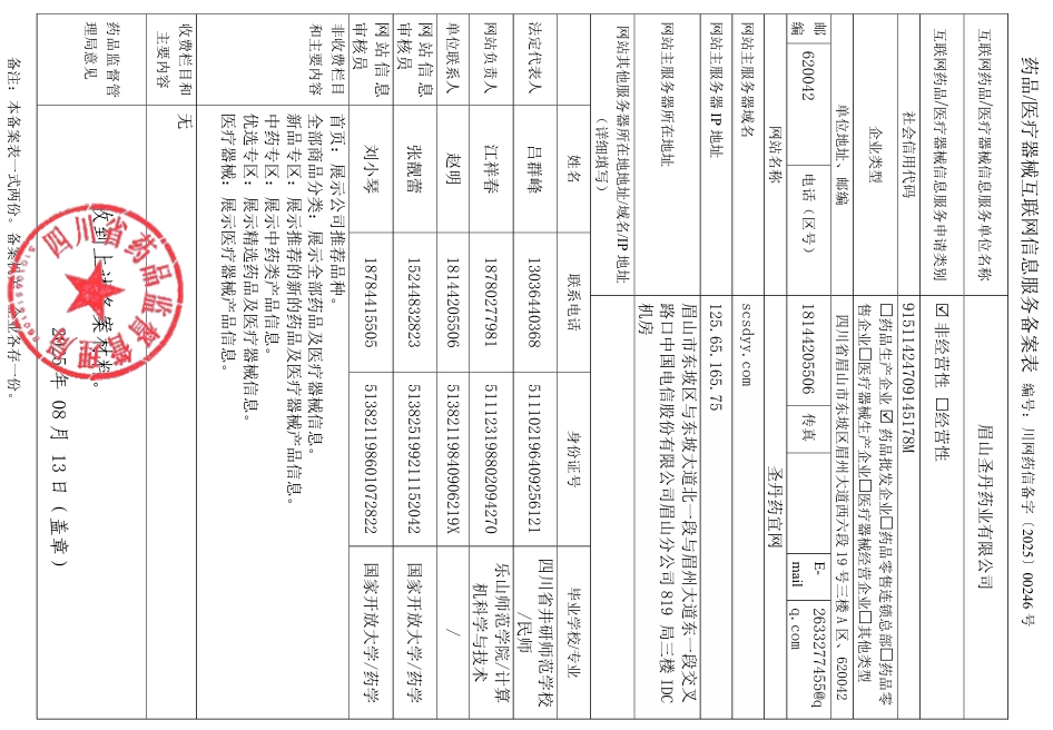互联网药品信息服务资格证书:川网药信备字〔2025〕00246号 变更记录证书:变更记录证书 医疗器械网销备案: 川眉食药监械经营许202000001